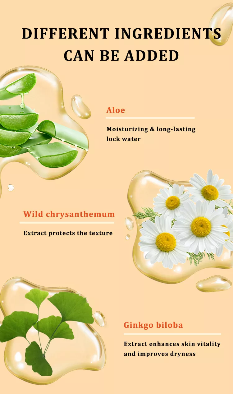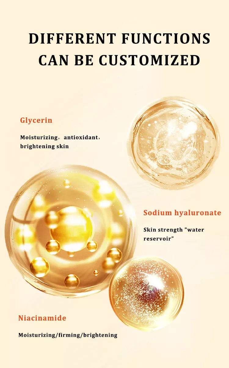 हम उत्पाद के विशिष्ट अवयवों (उदाहरण के लिए मुख्य हयालूरोनिक एसिड, नियासिनामाइड, विटामिन ई, विशिष्ट पौधों के अर्क, आदि), सुगंध (जैसे गुलाब, सफेद चाय, बिना सुगंध, आदि) के आधार पर आपके इच्छित फ़ॉर्मूले को भी अनुकूलित कर सकते हैं, और क्या इसका विशेष प्रभाव है (उदाहरण के लिए मजबूत मरम्मत, सफेदी, मजबूती, आदि)।